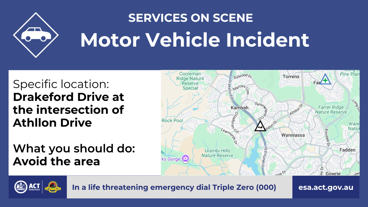 09:45am Saturday 3 Jan 2026 Attachment mva-drakeford-69584a96c7415 png ( 389.28 KB ) There's been a motor vehicle incident on Drakeford Drive, at the intersection of Athllon Drive in Kambah.Drakeford Drive is reduced to one lane in both directions.The community is asked to avoid the area, and use an alternative route.