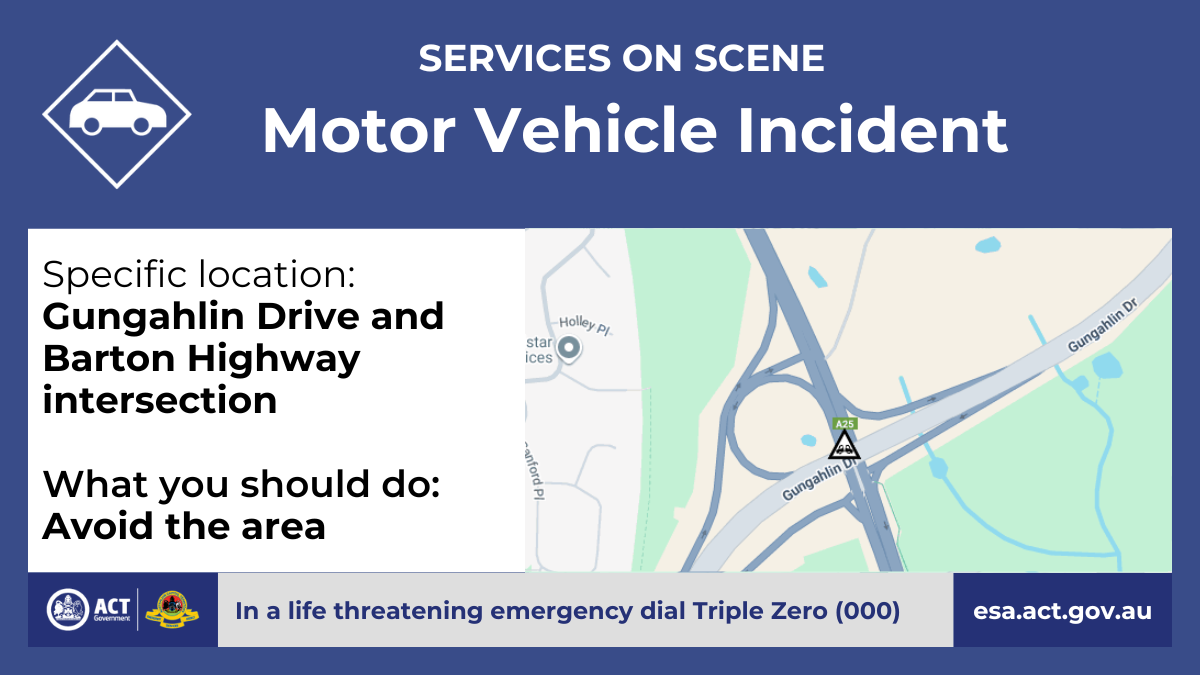 A motor vehicle incident has occurred on Gungahlin Drive, near the intersection with the Barton Highway.