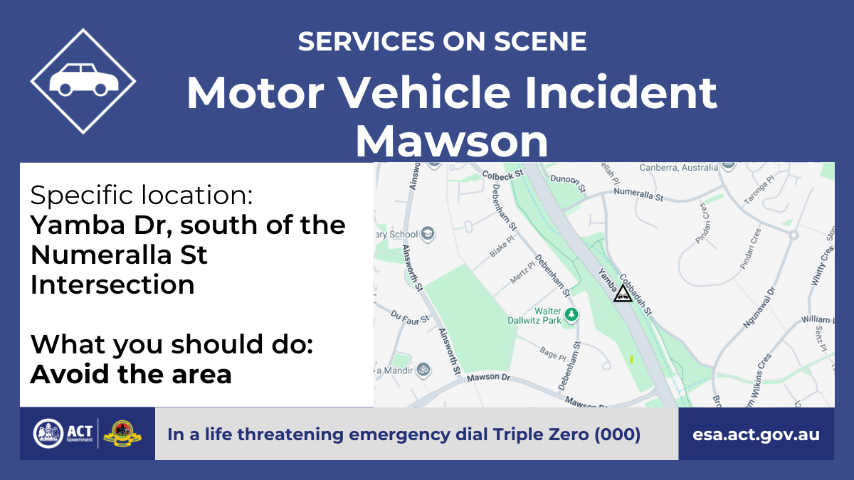 There's been a motor vehicle incident on Yamba Drive in Mawson, just south of the Numeralla Street intersection.