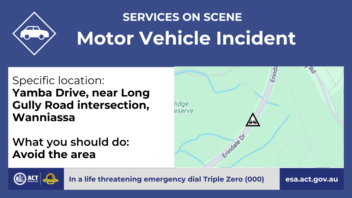 There's been a motor vehicle incident on Erindale Drive, near the intersection with Long Gully Road in Wanniassa.