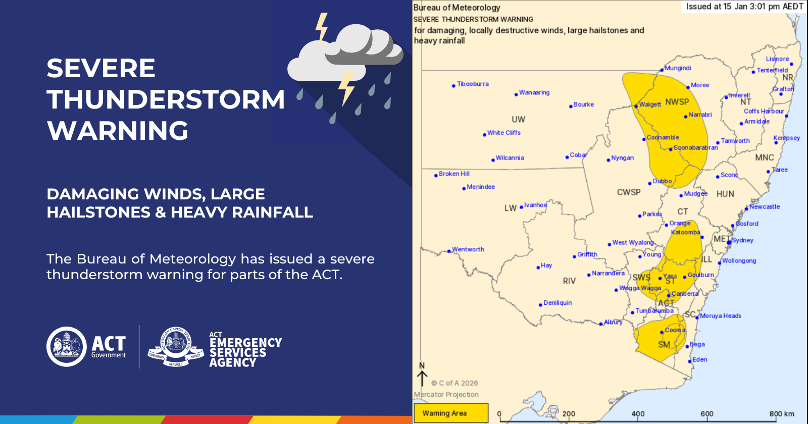 The weather situation can change rapidly, check http://www.bom.gov.au/act/ for weather updates and warnings.
